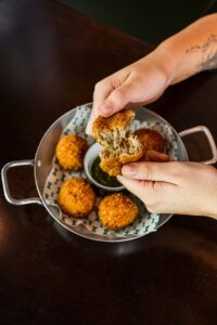 A grande estrela entre os bolinhos, ficando com o título de “mais pedido”, é o de Cupim com cream cheese. Este corte de carne é um dos prediletos do chef João, e ganha tratamento especial: cozida lentamente e depois desfiada, é então misturada com o queijo cremoso e a cebola caramelizada. “Utilizamos farinha somente para empanar o bolinho: na massa não vai nada. É pura carne e complementos. Todos nossos bolinhos têm esta característica”, conta o chef. “Para acompanhar temos ainda um pesto de rúcula com hortelã feito na casa também de forma artesanal”.