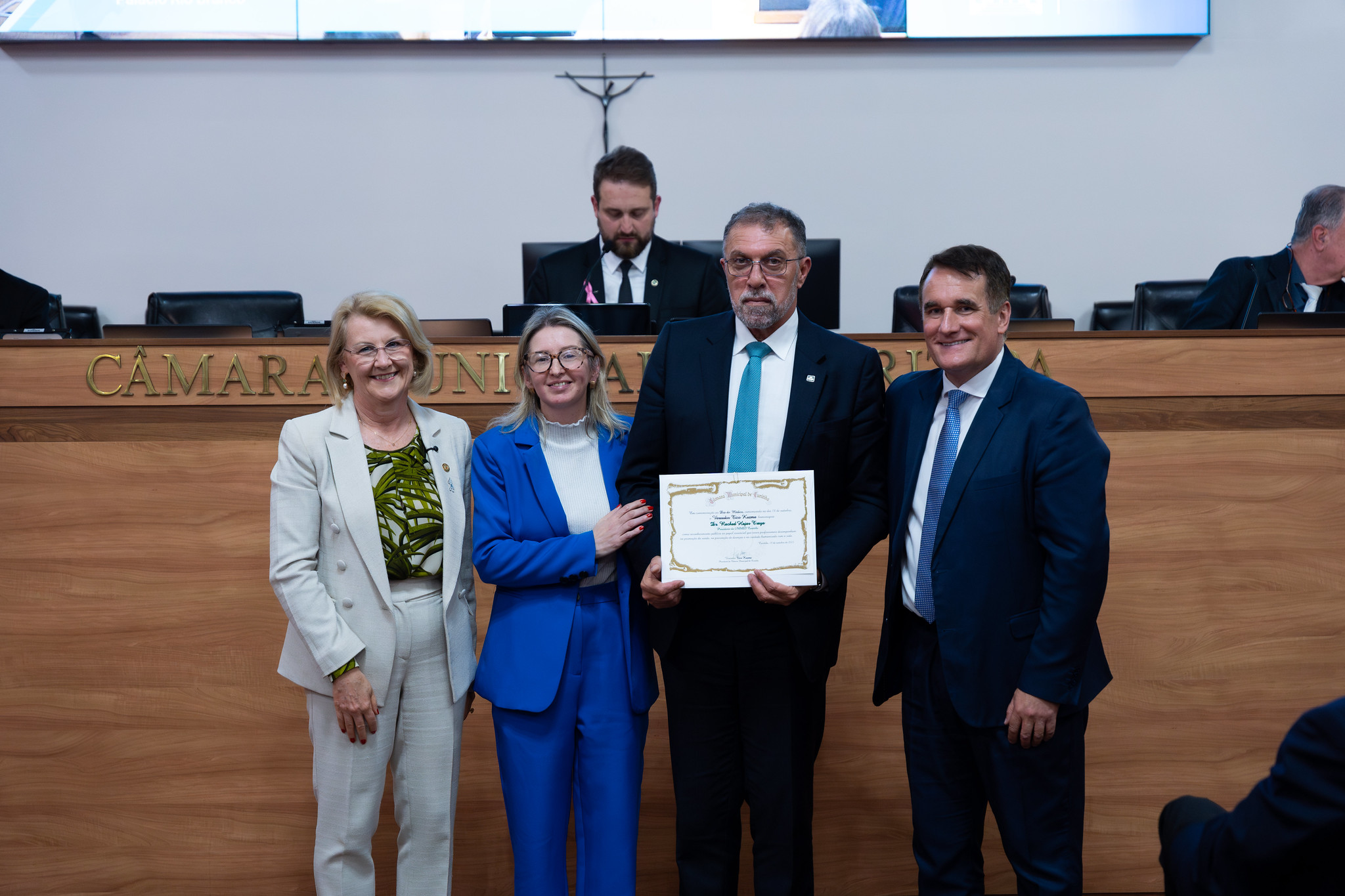 Rached Hajar Traya, diretor-presidente da Unimed Curitiba, foi homenageado na sessão solene realizada na Câmara Municipal de Curitiba (CMC) nesta quarta-feira (15). A honraria é um reconhecimento pelo Dia do Médico, celebrado em 18 de outubro. A cerimônia foi presidida pelo vereador Tico Kuzma (PSD-PR), atual presidente do Legislativo Municipal, que fez a entrega do certificado ao médico proctologista e dirigente da maior operadora de planos de saúde do Paraná. Médicos conselheiros do Conselho Regional de Medicina do Paraná (CRM-PR) e renomados profissionais prestigiaram o momento que destaca a trajetória e as contribuições dos médicos para a área da saúde na capital paranaense.