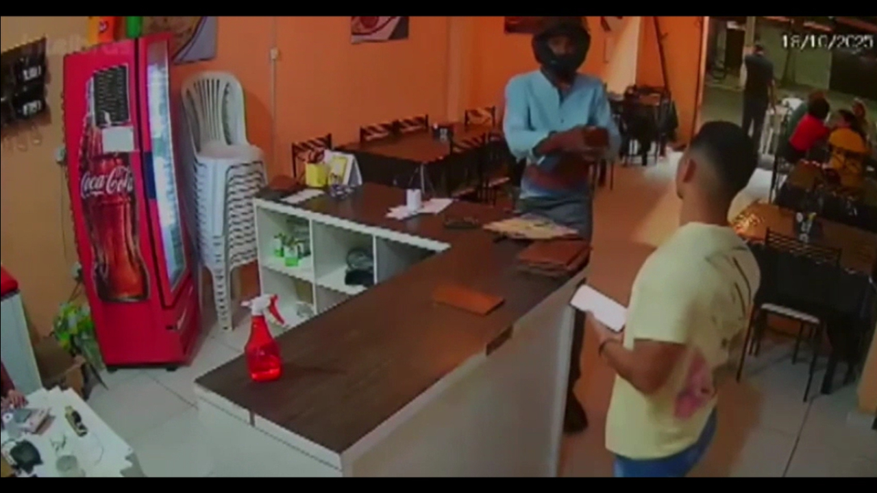 Na noite desse sábado (19), em Canavieiras, Bahia, um crime chocante foi registrado por câmeras de segurança; Carlos André da Silva Júnior, proprietário de uma pizzaria, foi assassinado a tiros dentro do estabelecimento. As imagens mostram o momento em que ele dialoga com um suspeito, que, repentinamente, saca uma arma e dispara várias vezes, causando pânico entre clientes e funcionários.