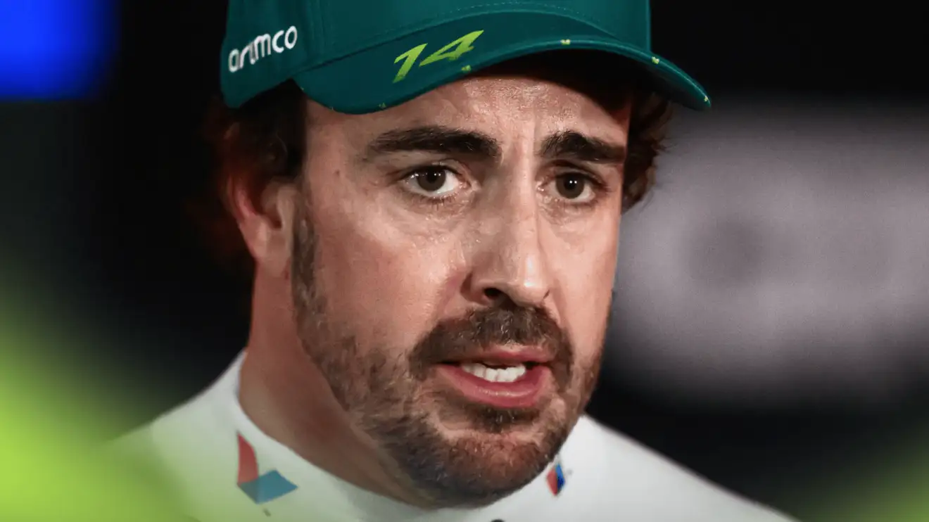Fonte: A close-up shot of Fernando Alonso speaking to the media