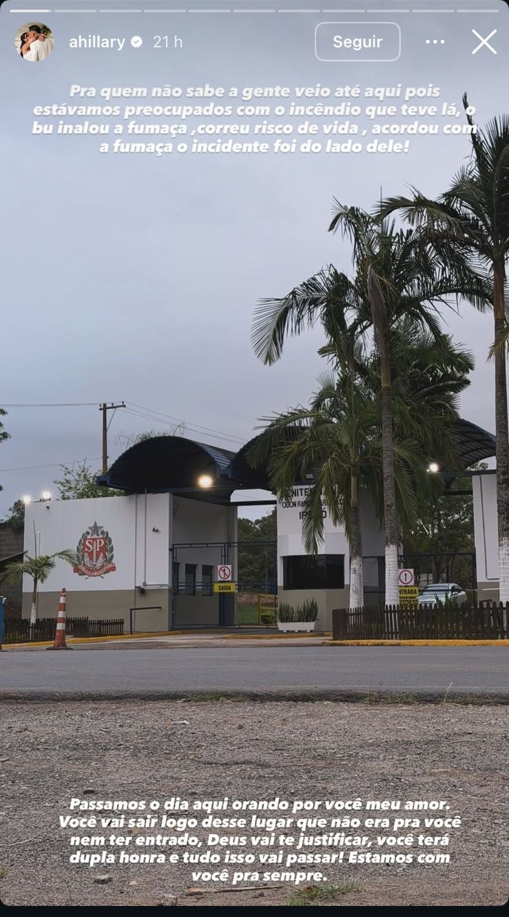 Hillary passou o dia do lado de fora do presídio, orando e aguardando informações sobre o estado de saúde do marido. “O Bu inalou a fumaça, correu risco de vida, acordou com a fumaça, o incidente foi do lado dele!”, escreveu Hillary em seus stories. Apesar do susto, ela garantiu que o influenciador está bem e segue em recuperação após o ocorrido.