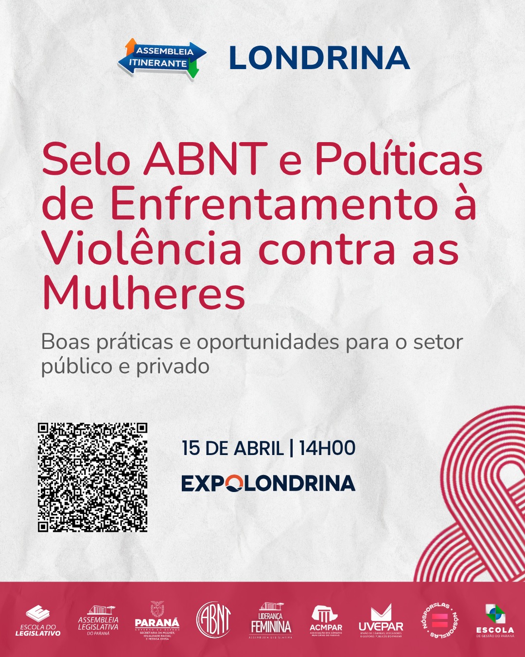 A cidade de Londrina recebe, no próximo dia 15 de abril de 2026, uma importante iniciativa voltada ao fortalecimento de políticas públicas e privadas de combate à violência contra as mulheres. A palestra “Selo ABNT e Políticas de Enfrentamento à Violência contra as Mulheres, boas práticas e oportunidades para o setor público e privado” integra a programação da Assembleia Itinerante e propõe um espaço qualificado de debate, troca de experiências e disseminação de conhecimento.
